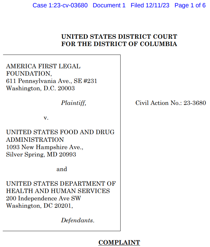 Tháng 12/2023, AFL đã khởi kiện Bộ Y tế và FDA Mỹ vì che giấu hồ sơ về ivermectin (ivm) và hydroxychloroquine (hcq). [2] [3]